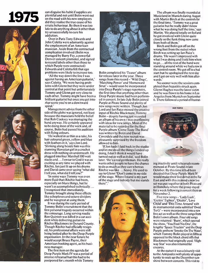 Onto the turntable, lit my incense and laid back on my bed and played it hrough - fucking awesome. The first song Coming Home was just awesome, but something was very familiar, but odd at the same time. I had never heard Ritchie Blackmore play guitar like he did on this album. After about the fourth play-through, I started to look at and read the album jacket - What the fuck? Tommy Bolin is their new guitarist? I had no idea. After about another 100 playthroughs, I could hear Tommy’s style that I heard on those two James Gang albums. Come Taste The Band didn’t leave my turntable for the longest time, and Tommy became my #1 fave guitarist from then on.